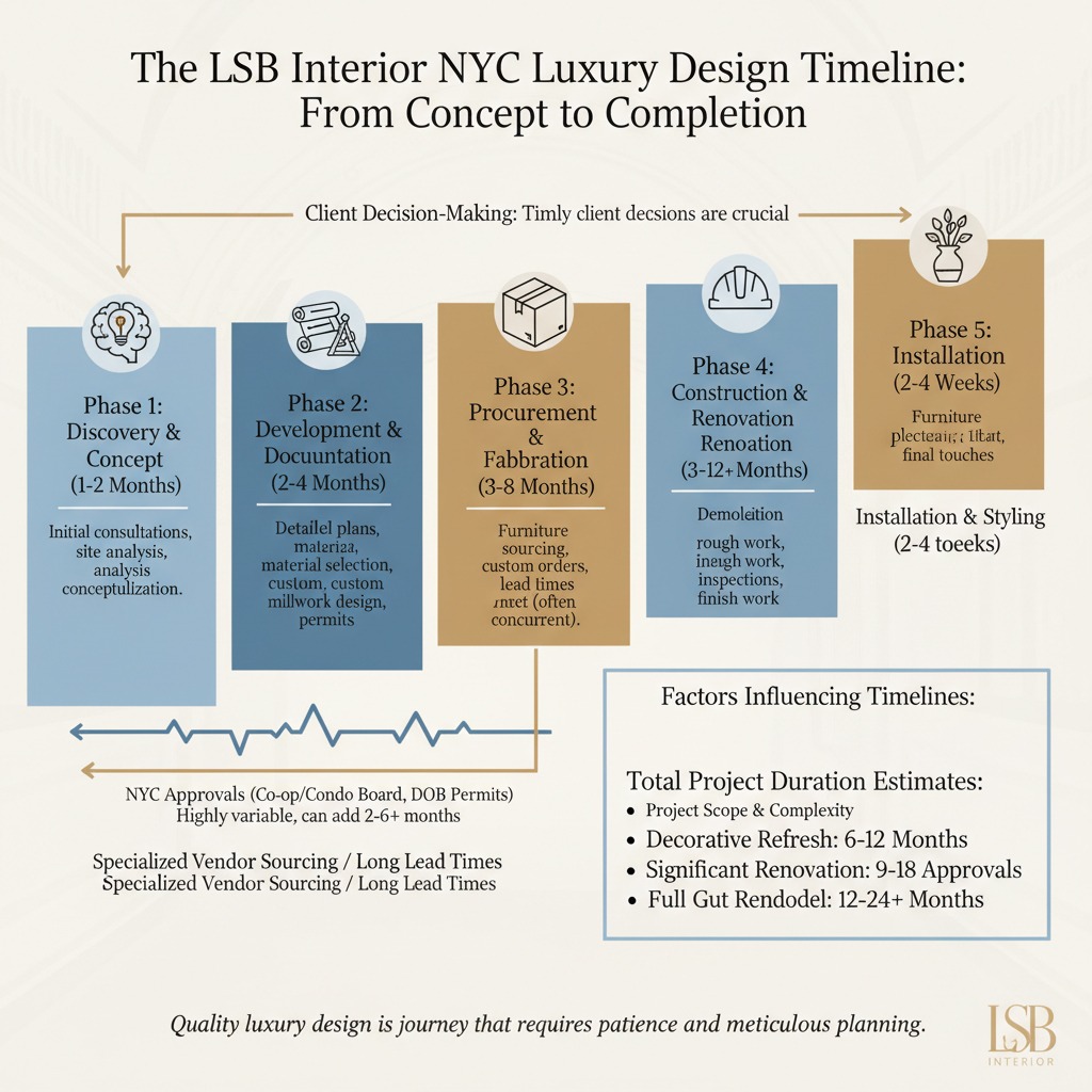 For discerning homeowners in New York City, the vision of a transformed residence blending Parisian elegance with modern urban living is an exciting prospect. A common question is the project timeline. LSB Interior understands that high-end interior design is a significant undertaking requiring exquisite taste, precise execution, and a clear understanding of the journey. Realistic expectations are paramount in a dynamic city like New York. Transformative, high-quality design takes time, unlike expedited timelines seen in media. This guide provides a realistic, phase-by-phase breakdown for luxury interior design projects in Manhattan, Brooklyn, and beyond.